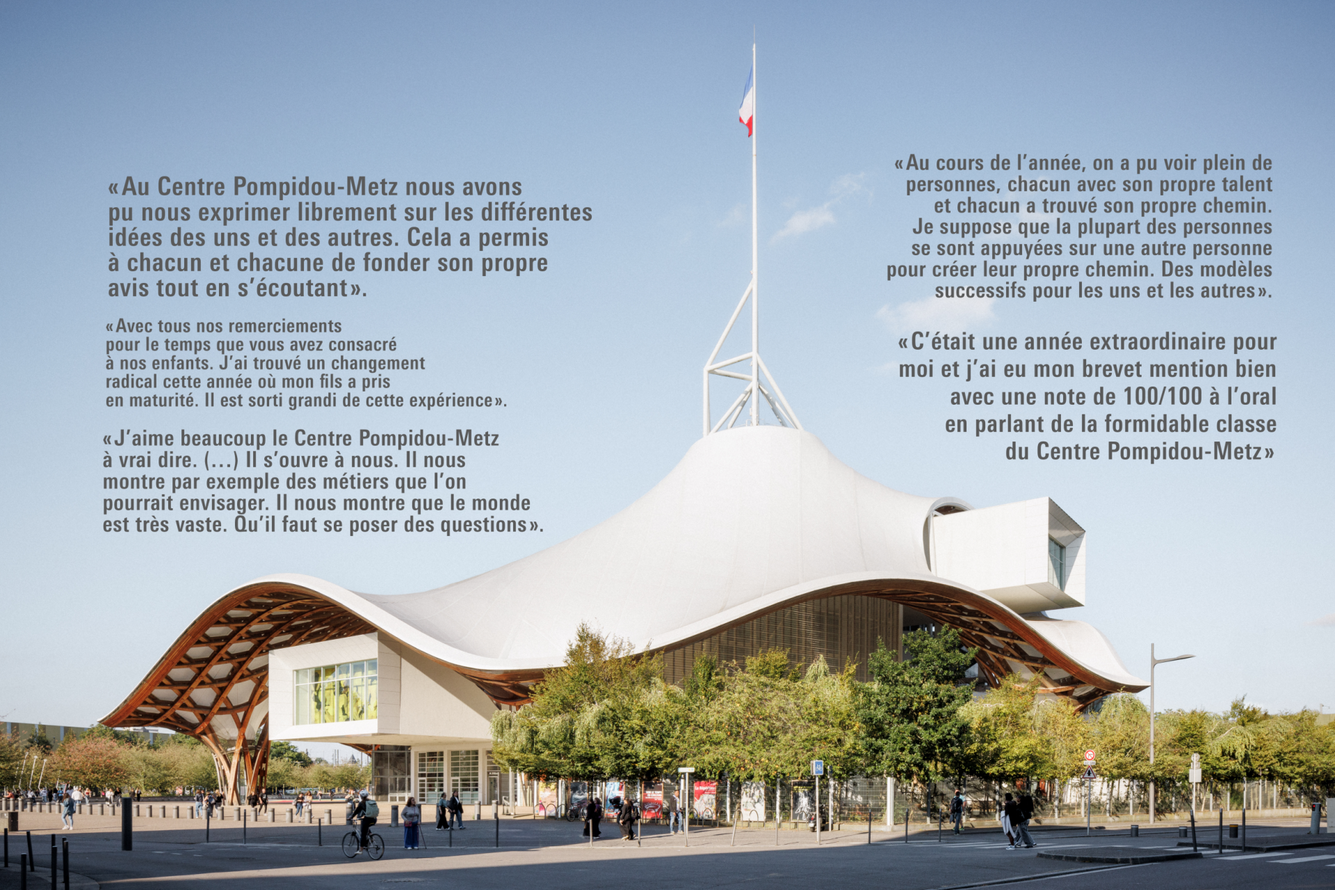 L’École du Centre Pompidou-Metz est le résultat des valeurs de transmission, de partage et de curiosité à destination des jeunes publics qui font l’âme du musée depuis son ouverture. Du projet des petits médiateurs à Ecoletopie -une classe installée dans l’exposition L’art d’apprendre. Une école des créateurs- l’éducation artistique et culturelle est ancrée dans l’ADN du Centre Pompidou-Metz. Ainsi, son École se veut un espace où les idées, les imaginaires et les paradigmes sont librement débattus et réinventés. Son principal objectif est d’encourager les adolescents à se sentir pleinement vivants dans l’exploration de la pensée créative.