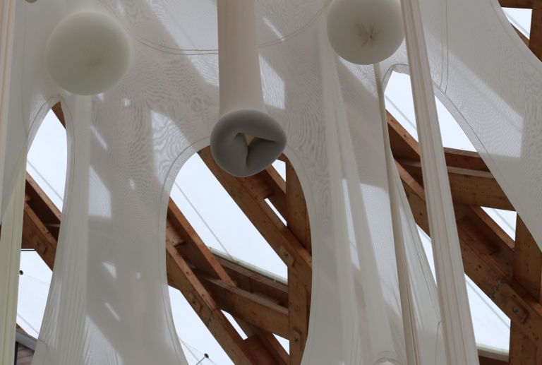 - L’artiste britannique expose ses peintures monumentales brutes, accrochées à la toiture, qui s’inscrivent dans un dialogue avec l’architecture et jouent avec les différents points de vue.