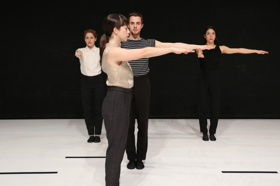 Claude Shannon est une pièce initialement créée pour la scène. La partition qui détermine la chorégraphie, l’espace et la musique de cette « machine » se base sur une contrainte tirée au hasard à chaque représentation, générée par un algorithme et établie à partir de liens entre les mots d’une phrase tirée du fameux essai de Claude Shannon, fondateur de la théorie de l’information, A Mathematical Theory of Communication (1948). Juste avant chaque performance, les danseuses apprennent une nouvelle séquence chorégraphique parmi le milliard de possibilités contenues dans la phrase. En résulte une pièce d’une rigueur fascinante, avec une gestuelle minimale et précise qui nous invite à un voyage aiguisant l’attention et les sens.