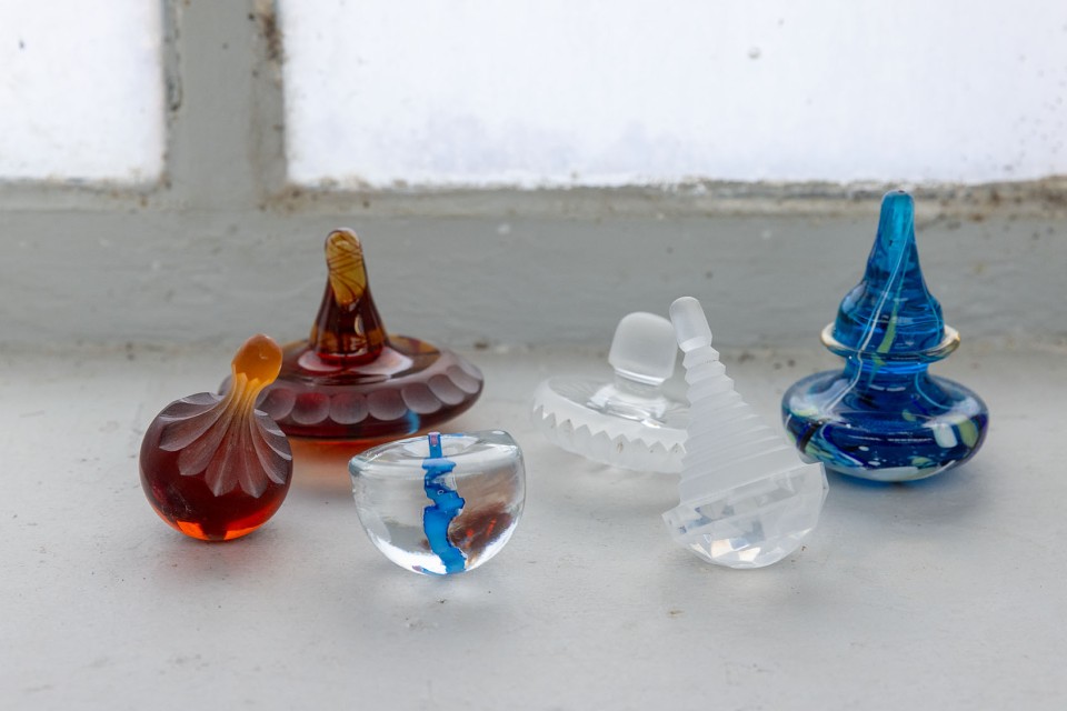 Au cours de ce projet, Linda Sanchez, en étroite collaboration avec les artisans de la cristallerie, a créée des pièces uniques, développées à partir de recherches sur les couleurs et les motifs. Ici, plusieurs toupies sont exposées, et trois toupies d'entres elles sont mises à disposition du public pour être manipulées et testées. Le dispositif est également accompagné d'une vidéo montrant les toupies en rotation, et d’un texte de présentation retraçant le processus de création et la démarche de l’artiste.